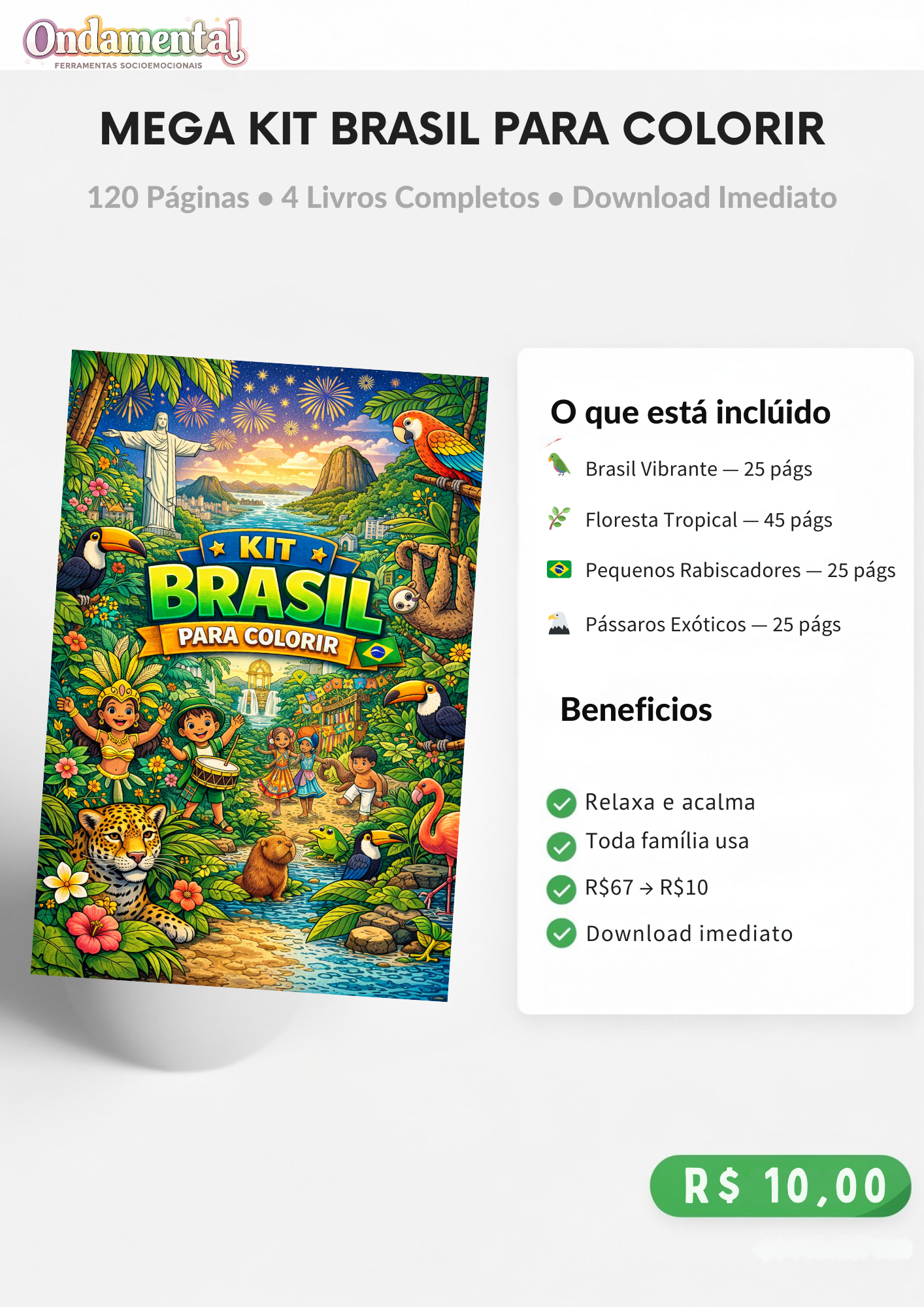 4 livros completos de colorir + acesso vitalício por apenas R$10. Download imediato e impressão ilimitada.