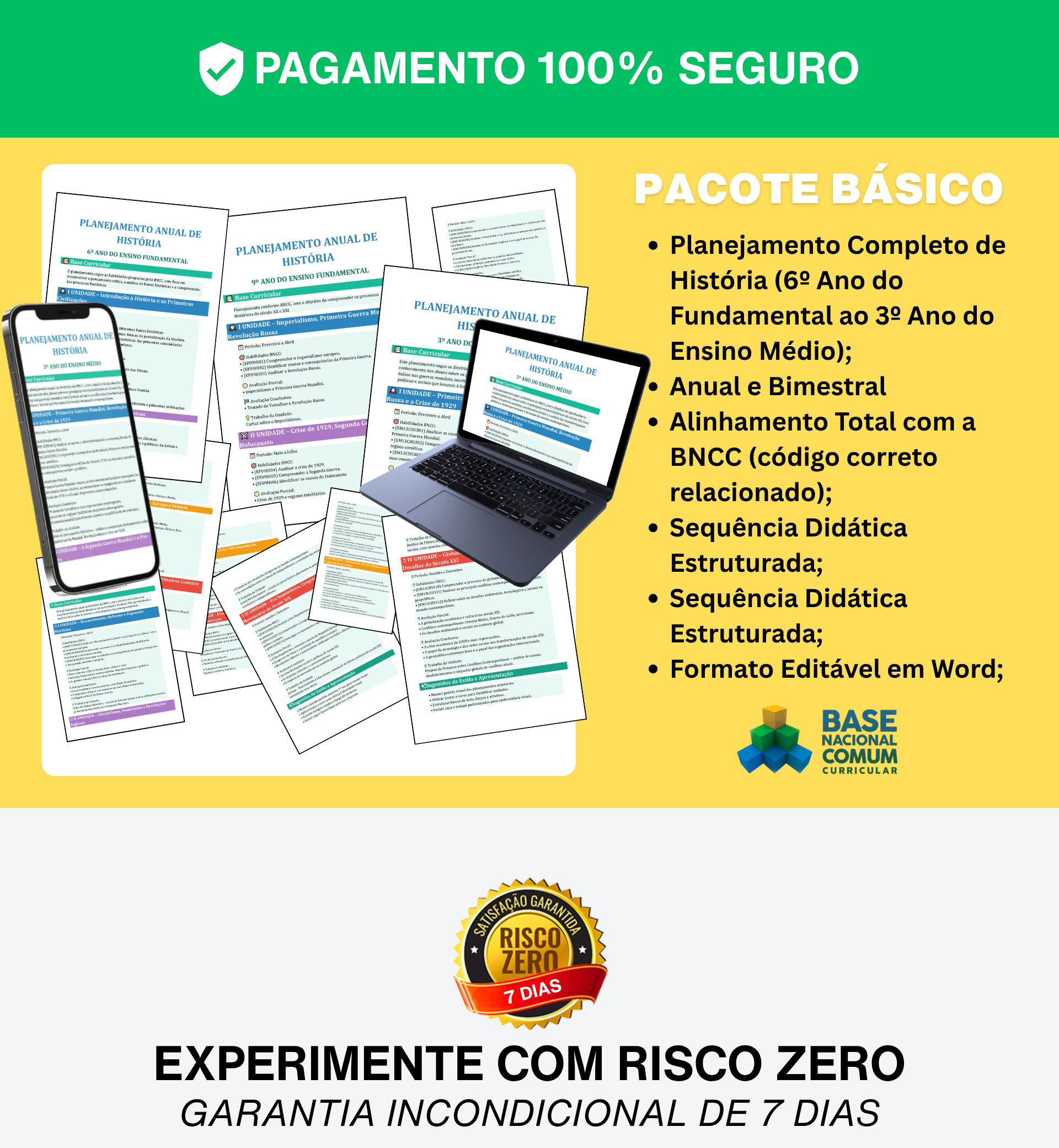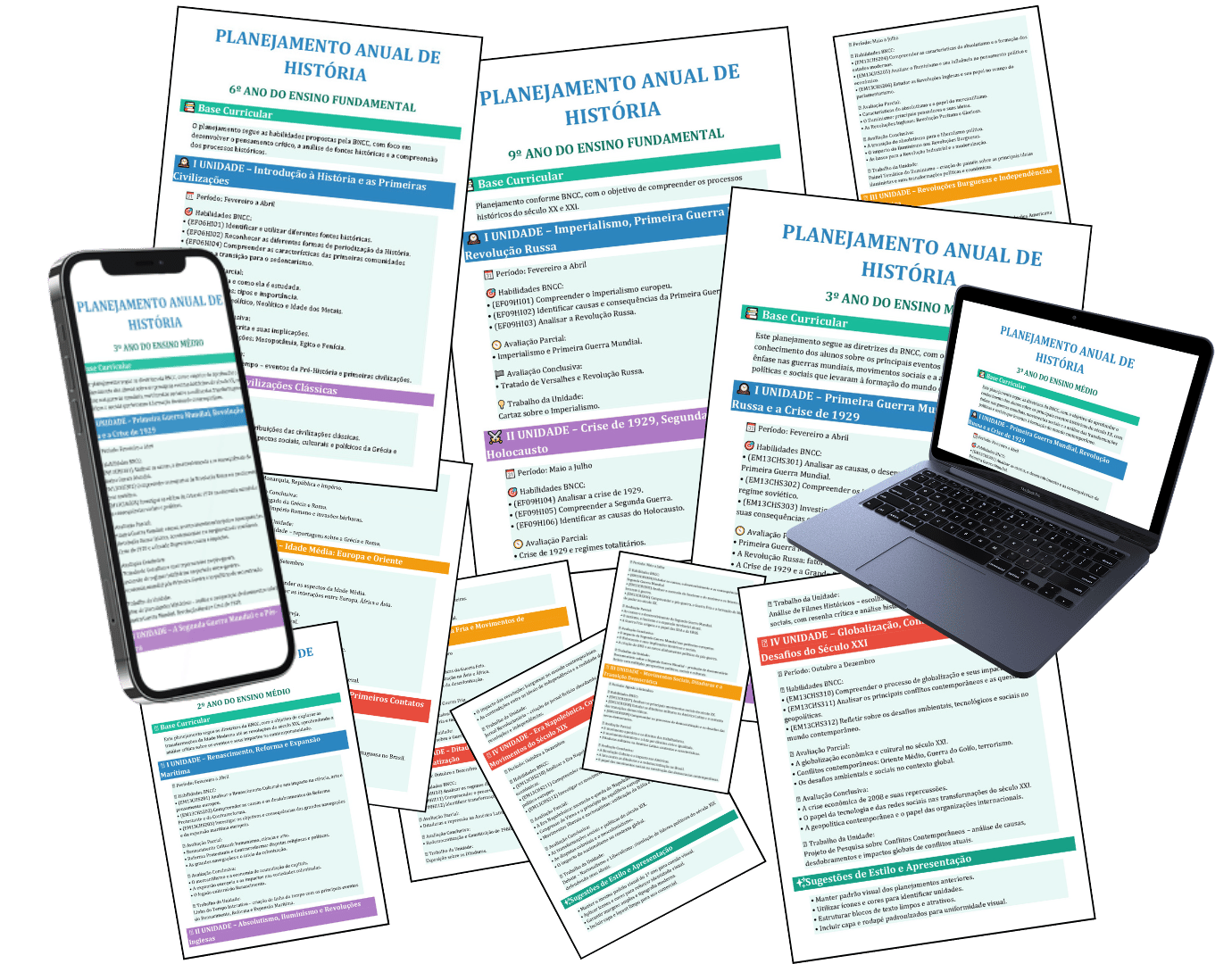 Planejamentos anuais e bimestrais prontos e organizados, alinhados à BNCC, abrangendo do 6º ano do fundamental II até o 3º ano do ensino médio, para que você economize horas de preparo.